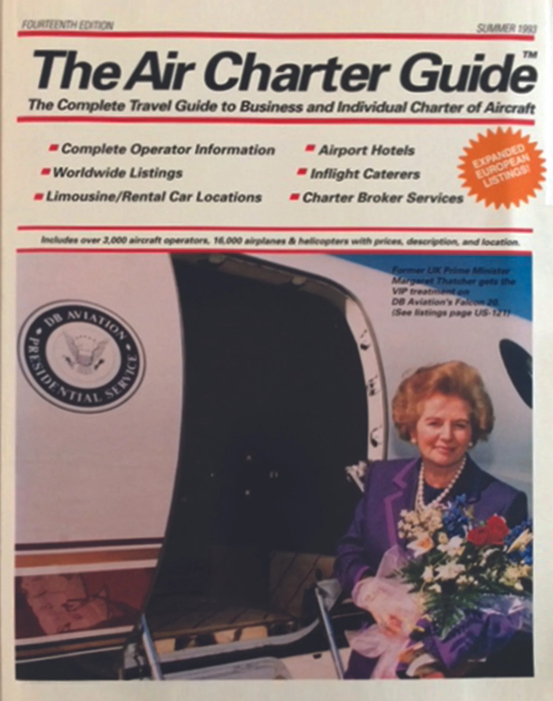 Hopefully, you are flying in style and can enjoy safe travel like former UK Prime Minister Margaret Thatcher getting the VIP treatment on a Falcon 20 operated by DB Aviation as featured on this old blast-from-the-past cover of The Air Charter Guide from 1993. Back in the day, DB Aviation at Waukegan National Airport in the Chicago metro area also ferried former Soviet Prime Minister Mikhail Gorbachev and then-presidential candidate Bill Clinton. One wonders if all three ever crossed paths at the same time.